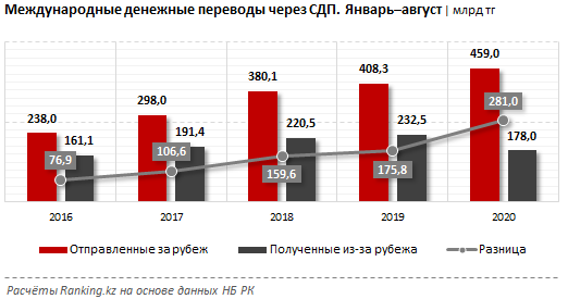 При этом объем полученных денежных средств, наоборот, сократился — на 23,4%, до 178 млрд тг. Соответственно разница между отправленными за рубеж и полученными оттуда средствами увеличилась со 175,8 млрд до 281 млрд тг. Фактически из РК за рубеж физические лица отправили через СДП в 2,6 раза больше денег, чем получили оттуда, сообщает ranking.kz.
