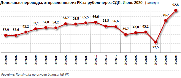 Объем средств, отправленных за рубеж через международные системы денежных переводов, в июне 2020 года составил рекордные 92,8 млрд тг. Это на 22,1 млрд тг превышает прошлый рекордный показатель, достигнутый месяцем ранее, в мае текущего года, сообщает портал ranking.kz.