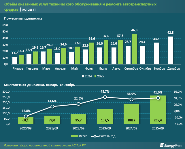 В сентябре 2025-го в Казахстане объём оказанных услуг по техническому обслуживанию (ТО) и ремонту автомобилей достиг 46,3 млрд тг — на 22,5% больше в стоимостном выражении, чем месяцем ранее (ИФО — 122,3%), и сразу на 61,2% больше, чем в сентябре прошлого года (ИФО — 137,3%), сообщает inbusiness.kz со ссылкой на Еnergyprom.kz.