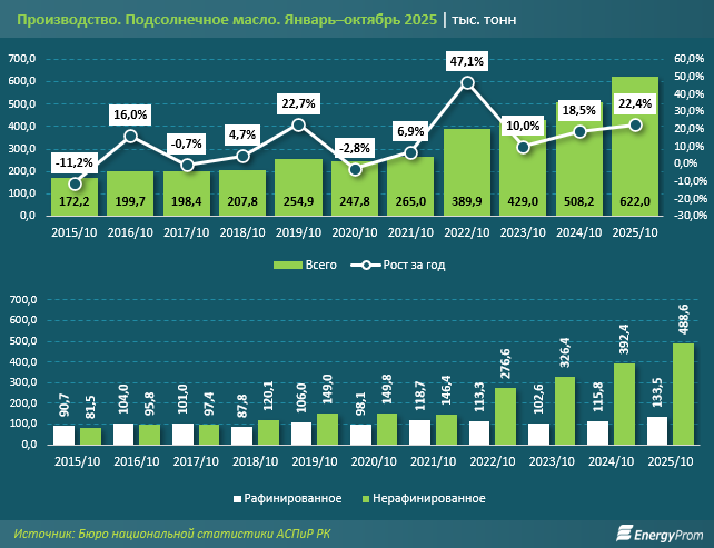 Так, за январь–октябрь текущего года было выпущено 622 тыс. тонн подсолнечного масла — на 22,4% больше, чем за аналогичный период 2024-го. Годом ранее был отмечен рост на 18,5%, сообщает inbusiness.kz со ссылкой на Еnergyprom.kz.