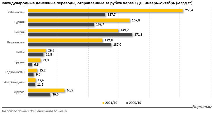 Более половины отправленных за рубеж денег было переведено в Узбекистан (255,4 млрд тг) и Турцию (167,8 млрд тг). Объём переводов в Узбекистан вырос почти в 2 раза, в Турцию - в 1,5 раза.