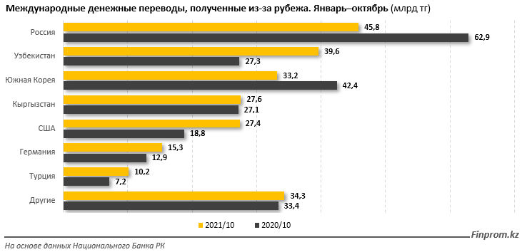 Ещё почти треть пришлась на Россию (149,2 млрд тг) и Кыргызстан (122,8 млрд тг); при этом объём переводов в Россию сократился на 13,1%, в Кыргызстан - на 10,3%.