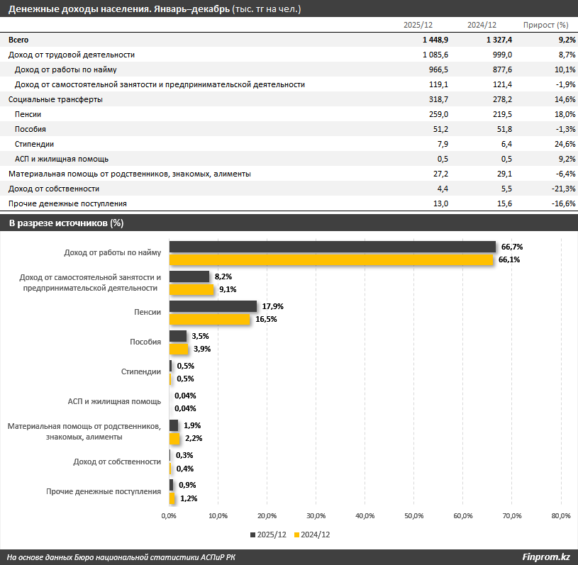 Основной источник — работа по найму — в январе–декабре 2025-го занимал уже 66,7% всех доходов (против 66,1% годом ранее), передает inbusiness.kz со ссылкой на Finprom.kz.