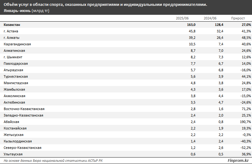 За январь–июнь текущего года предприятия и индивидуальные предприниматели в РК оказали услуг в области спорта на 163 млрд тг — на 27% больше в стоимостном выражении, чем за аналогичный период 2024-го, передает inbusiness.kz со ссылкой на Finprom.kz.