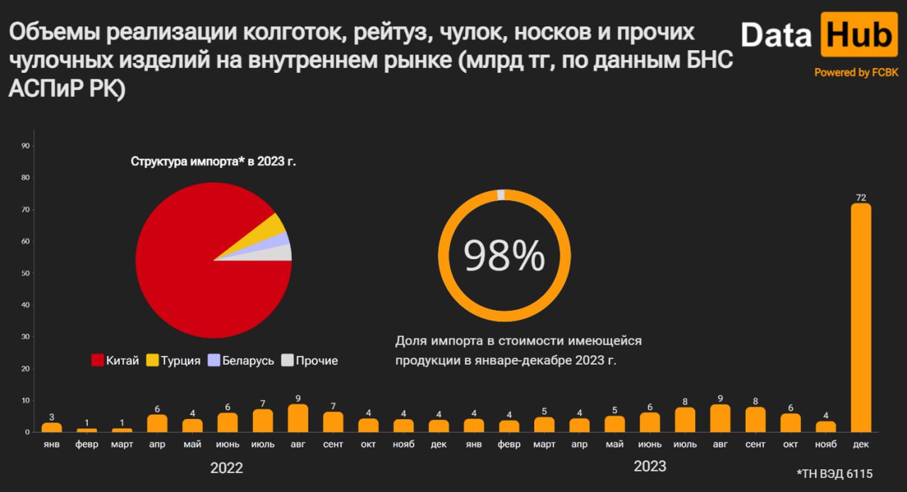 "Почти вся продукция поступает из-за рубежа, т.е. как раз в импорте и случился резкий всплеск. В долларах объемы ввоза чулочно-носочных изделий за месяц составили 157 млн долларов – в 20 раз больше, чем в декабре 2022-го.