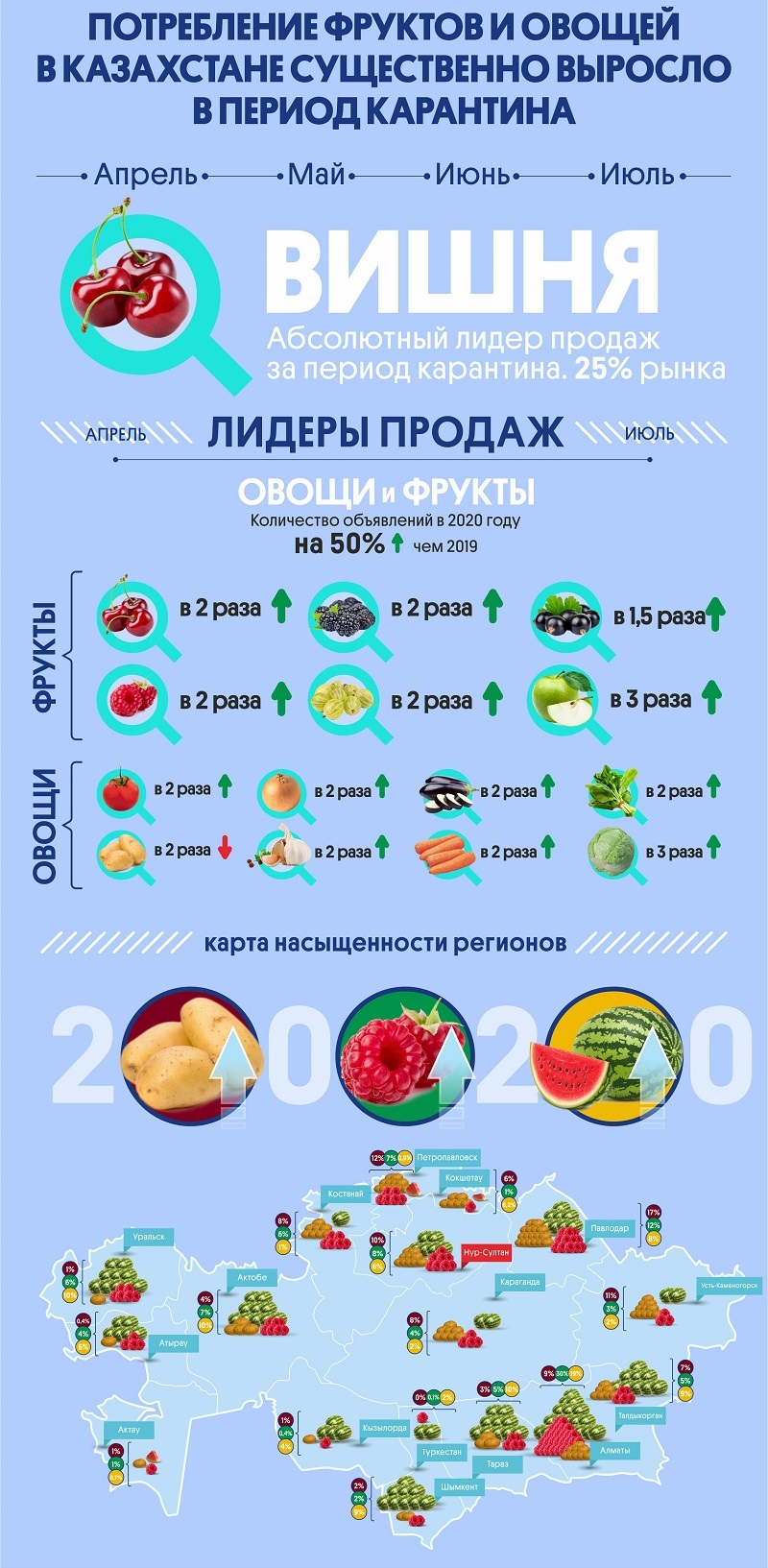 По статистике сервиса Olx.kz, за период апрель-июль 2020 года общее количество поданных объявлений в категории "Овощи и фрукты" на 50% превысило показатели аналогичного периода прошлого года.