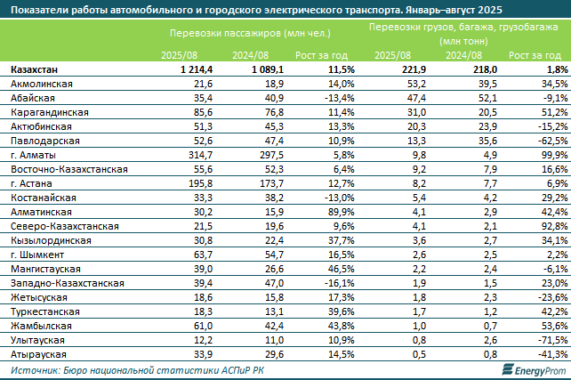 За январь–август текущего года в РК автомобильным и городским электрическим транспортом было перевезено 1,2 млрд пассажиров — на 11,5% больше, чем за аналогичный период 2024-го, сообщает inbusiness.kz со ссылкой на Еnergyprom.kz.