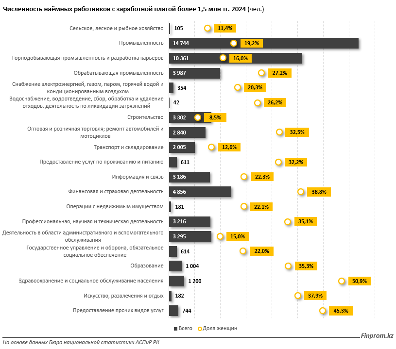 Наибольшая доля среди зарабатывающих более 1,5 млн тг в 2024 году приходилась на занятых в промышленности: 35% от общего числа, или 14,7 тыс. человек. В первую очередь на этот показатель повлиял нефтедобывающий сектор. На втором месте по численности хорошо зарабатывающих сотрудников оказалась сфера финансовой и страховой деятельности: 4,9 тыс. человек. В топ-3 также вошла деятельность в области административного и вспомогательного обслуживания: 3,3 тыс. человек. Меньше всего получающих такие большие зарплаты насчитывалось в коммунальной сфере: всего 42 человека.