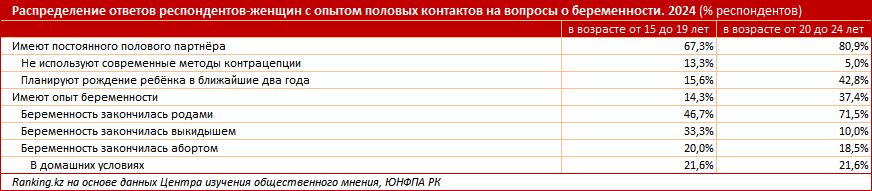 "Треть таких ситуаций закончилась выкидышем, пятая часть — абортом. Специалисты обращают внимание: в 21,6% случаев абортов эта процедура была проведена в домашних условиях, что несёт большие риски для женского здоровья. Впрочем, рождение ребёнка в 16 лет — едва ли лучший вариант для организма, к тому же подобная ситуация несёт риски совершенно иного толка — неосознанное родительство, детство в неполной семье, отсутствие образования и нереализованность матери", - пишет Ranking.kz.