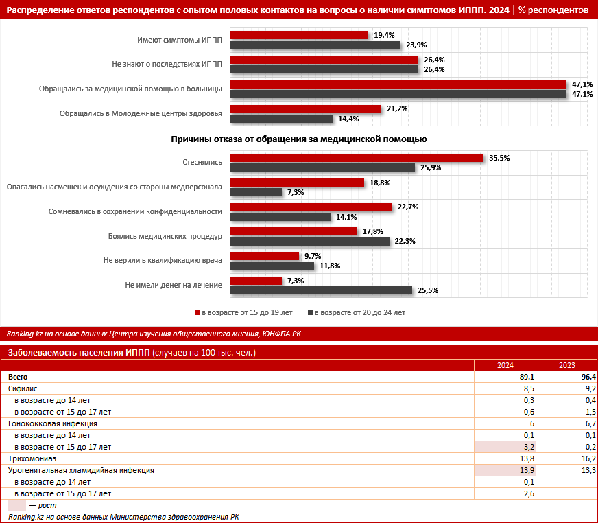 При этом, в целом, согласно статистике министерства здравоохранения РК, уровень заболеваемости казахстанцев половыми инфекциями в прошлом году снизился с 96,4 до 89,1 случая на 100 тыс. населения. В абсолютном выражении ИППП были выявлены у 18 тыс. человек.
