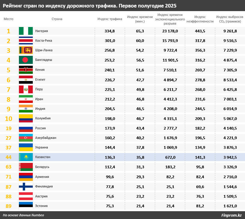 По итогам первого полугодия текущего года Казахстан занял 44-е место из 89 в рейтинге Numbeo по индексу дорожного трафика, передает inbusiness.kz со ссылкой на Finprom.