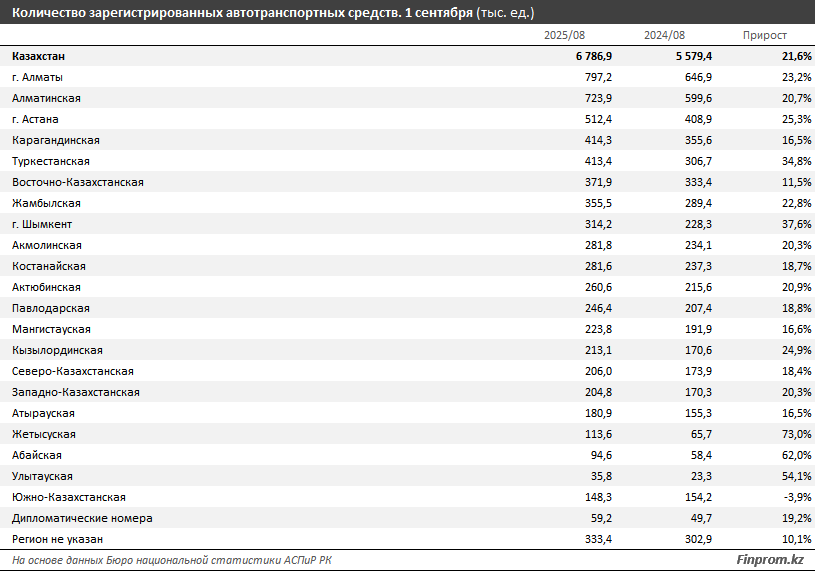 На 1 сентября 2025-го в Казахстане было зарегистрировано 6,8 млн автотранспортных средств — на 21,6% больше, чем на аналогичную дату прошлого года. Среди них насчитывалось 5,9 млн легковых автомобилей, 639,2 тыс. грузовых автомобилей, 118 тыс. автобусов и 135,3 тыс. единиц мототранспорта.