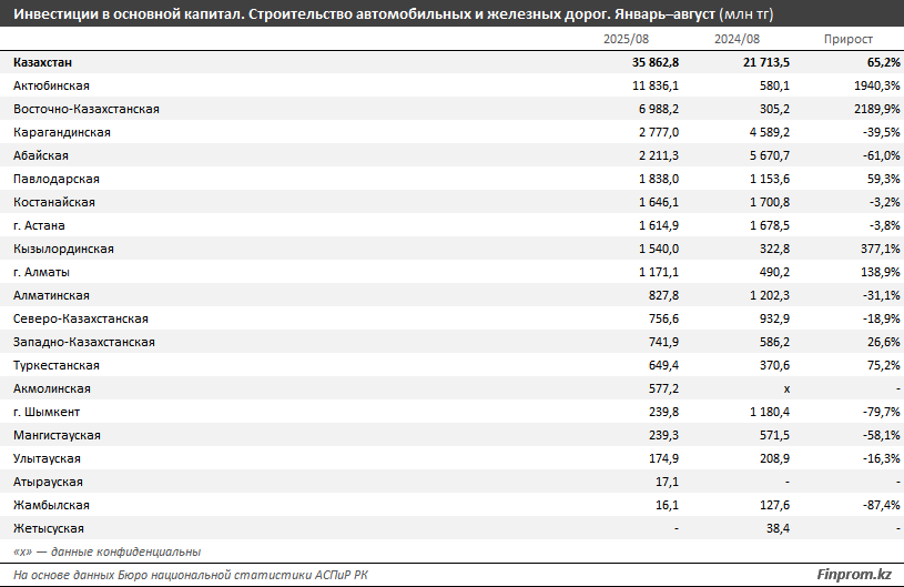 В региональном разрезе наибольшие объёмы инвестиций в основной капитал в сфере строительства автомобильных и железных дорог были зафиксированы в Актюбинской (11,8 млрд тг), Восточно-Казахстанской (7 млрд тг) и Карагандинской (2,8 млрд тг) областях. В пятёрку регионов-лидеров также вошли Абайская и Павлодарская области: 2,2 млрд и 1,8 млрд тг соответственно. На эти пять регионов совокупно пришлось 71,5% всех капвложений в секторе.