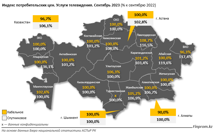 Тем временем удорожание услуг кабельного телевидения продемонстрировали сразу пять регионов: Карагандинская, Павлодарская, Жамбылская, Улытауская и Мангистауская области.
