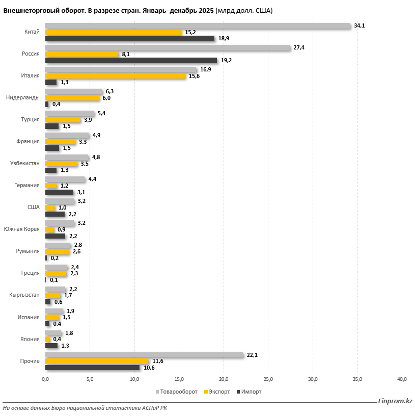 По данным Finprom.kz, экспортная география при этом была ярко выраженно европейской за счёт нефти. Крупнейшим торговым партнёром по экспорту стала Италия: 15,6 млрд долл.), или почти 20% всего экспорта из Казахстана. Значительные объёмы также пришлись на Нидерланды, Францию, Румынию и Грецию. Европейский вектор остаётся ключевым для сырьевого экспорта.