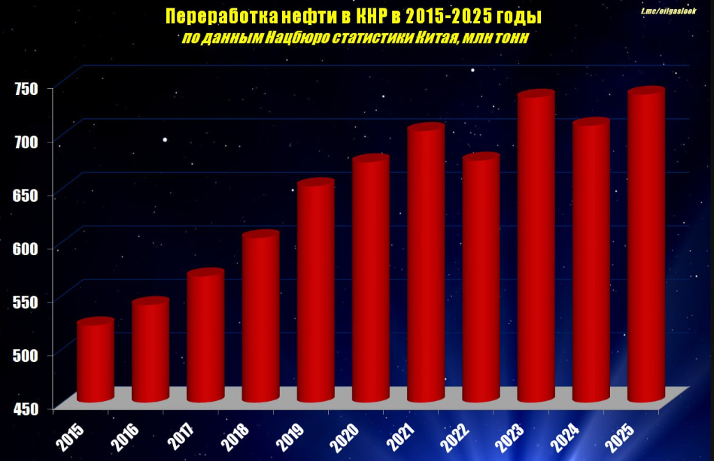 Китай установил новый исторический рекорд в нефтепереработке, переработав в 2025 году 737,6 млн тонн нефти, что почти на 3 млн тонн превышает предыдущий максимум, зафиксированный в 2023 году. Этот показатель отражает устойчивый рост энергетической отрасли страны и усилия правительства по обеспечению внутреннего спроса на нефтепродукты, передает inbusiness.kz со ссылкой на телеграм-канал OilGazLook.