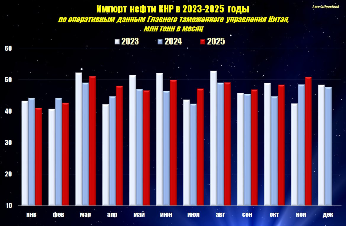 "За одиннадцать месяцев текущего года Китай закупил почти 522 млн тонн нефти. Этот показатель составил 103,2% к уровню января–ноября 2024 года, что говорит о сохранении устойчивого спроса на сырьё со стороны крупнейшего импортёра нефти в мире", - отмечают эксперты нефтяного рынка.