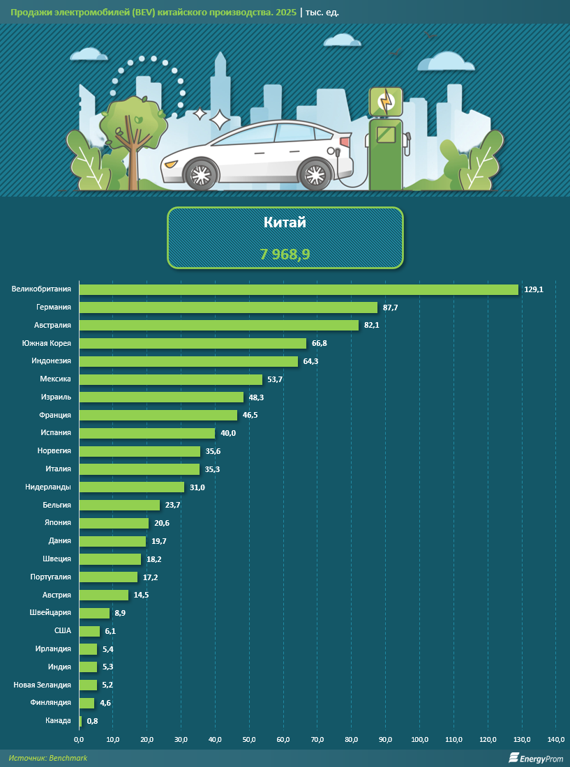 Активно растёт и присутствие китайских электромобилей на международных рынках. В 2025 году крупные объёмы продаж китайских аккумуляторных электромобилей были зафиксированы в Великобритании, где реализовано 129,1 тыс. машин. В Германии продажи достигли 87,7 тыс. единиц, в Австралии — 82,1 тыс., в Южной Корее — 66,8 тыс., а в Индонезии — 64,3 тыс.