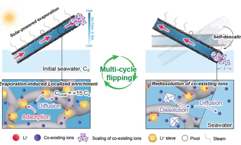 Когда солнечное излучение нагревает поверхность устройства, морская вода начинает испаряться. В результате, ионы лития концентрируются и направляются к адсорбенту, тогда как солевые отложения, в основном, образуются на приподнятом конце конструкции. Ключевая идея заключается в эффекте качелей. По мере накопления соли масса на одном конце увеличивается, устройство наклоняется в обратную сторону, и загрязненный участок погружается в воду. Океан сам смывает солевой налет, обеспечивая естественную самоочистку и непрерывную работу системы без остановок.