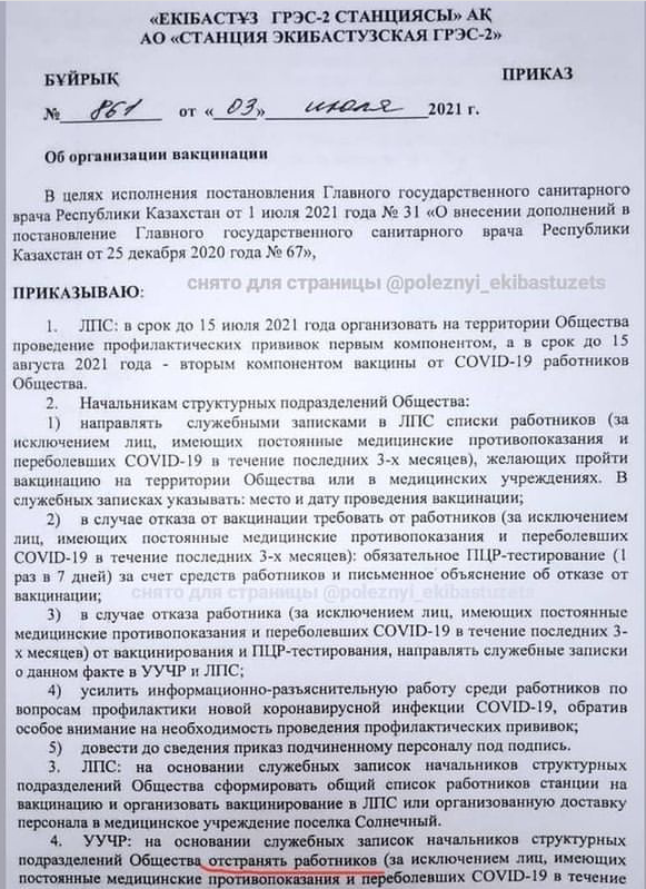 На Экибастузкой ГРЭС-2 пошли дальше. Согласно приказу председателя правления от 3 июля, опубликованному в Instagram, во исполнение постановления главного государственного санитарного врача РК теперь можно "отстранить работников (за исключением лиц, имеющих постоянные медицинские противопоказазния и переболевших COVID-19 в течение последних трех месяцев) актом работодателя". Впрочем, у непривитого сотрудника есть вариант – делать ПЦР-тест один раз в семь дней за свой счет.