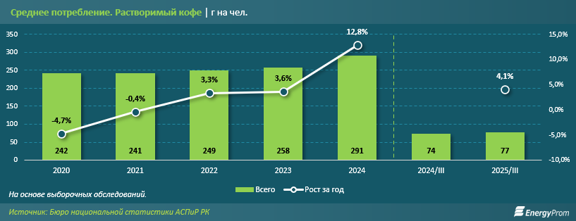 "Исходя из результатов выборочных обследований БНС, последние три года казахстанцы, наоборот, увеличивали потребление растворимого кофе. Это вполне объясняет растущий импорт. За третий квартал прошлого года среднее потребление кофе в РК составило 77 граммов на человека — на 4,1% больше, чем за аналогичный период 2024-го", - пишет Еnergyprom.kz.