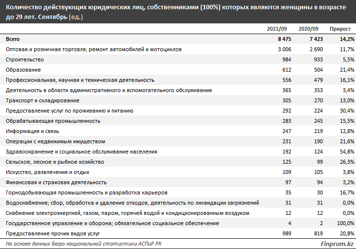 На 1 октября 2021 в стране было зарегистрировано 10,2 тыс. юридических лиц, собственниками которых на 100% являются женщины в возрасте до 29 лет. Это на 14,5% больше, чем годом ранее. 83% этих компаний — действующие: 8,5 тыс. юрлиц, плюс 14,2%. В том числе 7,6 тыс. действующих предприятий находится в городской местности (плюс 12,8% за год), 853 — в сельской (плюс 28,1%).