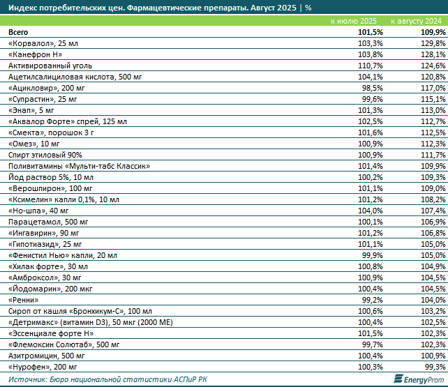 Среди тех лекарств, по которым Бюро национальной статистики (БНС) АСПиР РК ведёт регулярный мониторинг, в месячной динамике сильнее всего подорожали активированный уголь (на 10,7%), ацетилсалициловая кислота (на 4,1%), "Но-шпа" (на 4%), "Канефрон Н" (на 3,8%), "Корвалол" (на 3,3%), спрей "Аквалор Форте" (на 2,5%) и "Смекта" (на 1,6%). При этом не все препараты продемонстрировали удорожание: капли "Фенистил Нью" стали дешевле на 0,1%, "Флемоксин Солютаб" — на 0,3%, "Супрастин" — на 0,4%, "Ренни" — на 0,8%, "Ацикловир" — на 1,5%.