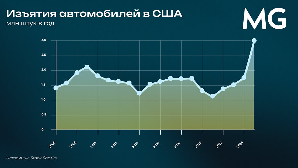 "Более 50% всех автомобилей в США, включая 80% новых машин, приобретаются в кредит. Банки кредитуют транспортные средства прямо в точках продаж, и обычно лишь 2–3% таких займов уходят в просрочку. Однако уже к осени 2025 года накопилось 7,5 млн предписаний об изъятии авто за неуплату. По итогам года под угрозой изъятия окажутся около 10,5 млн автомобилей. В реальности банки изымут лишь треть из них, но это всё равно более 3 млн машин — максимальный показатель с 2009 года", - отмечает аналитик movchans.com.