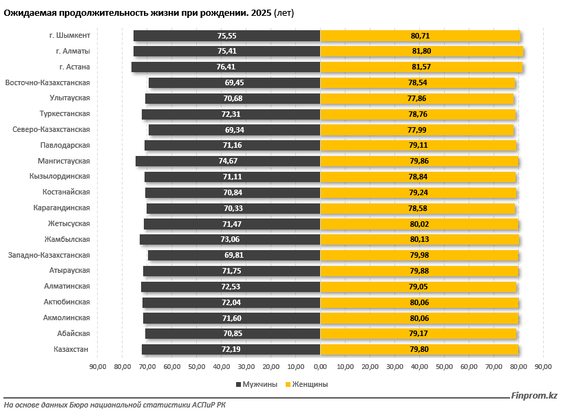 Ожидаемая продолжительность жизни при рождении в 2025 году у женщин составила 79,8 года, тогда как у мужчин — 72,19 года. Подобная ситуация наблюдалась во всех регионах страны, передает inbusiness.kz со ссылкой на Finprom.kz.