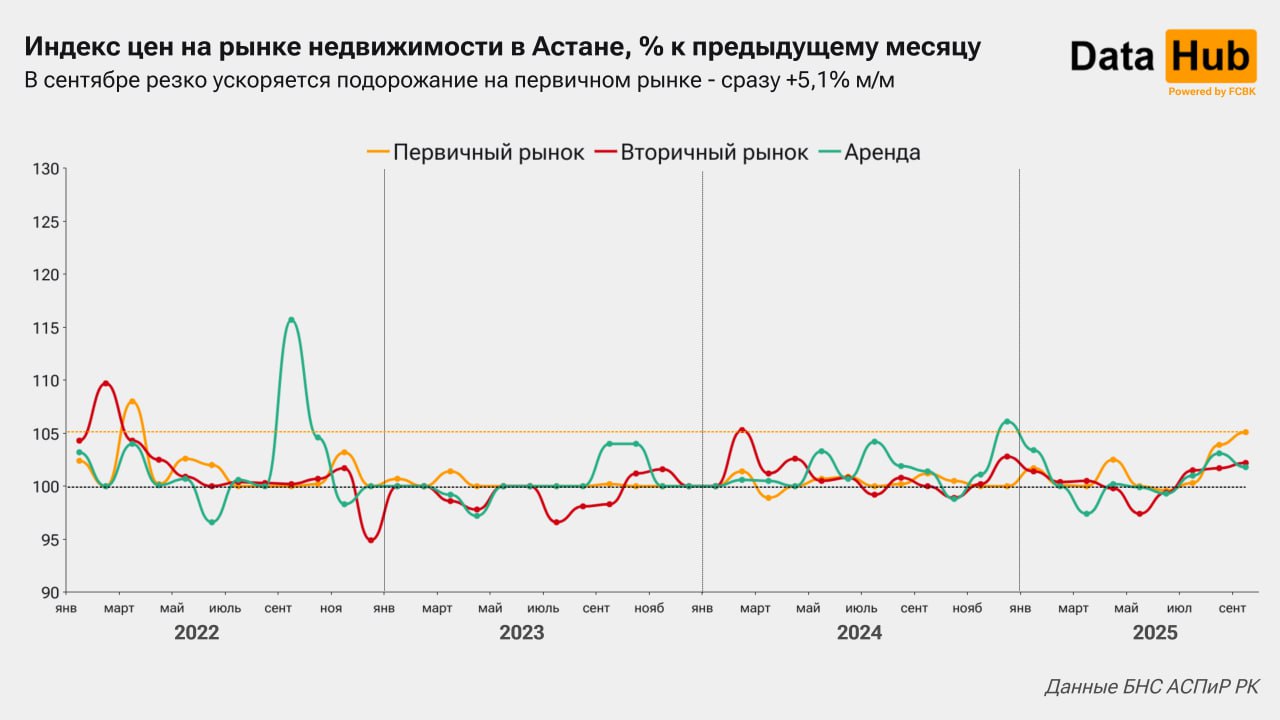 По данным Нацбанка РК, которые приводит Telegram-канал DATA HUB, в сентябре цены на первичном рынке прибавили сразу 5,1% м/м после и без того ощутимого скачка в августе, передает inbusiness.kz.