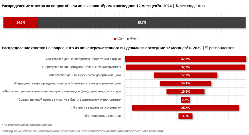 Специалисты Казахстанского института общественного развития (КИОР), подготовившие очередной аналитический отчёт, отмечают, что участие населения Казахстана в волонтёрской деятельности остаётся низким. Лишь 14,3% опрошенных подтвердили, что оказывали какую-либо безвозмездную помощь в течение последних 12 месяцев. Остальные 85,7% признались, что не участвовали в волонтёрских инициативах.