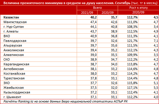 В разрезе регионов самая высокая величина прожиточного минимума традиционно наблюдается в Мангистауской области — 47,4 тыс. тг в среднем на душу населения. Следом идут Нур-Султан (44,1 тыс. тг) и Алматы (43,7 тыс. тг).