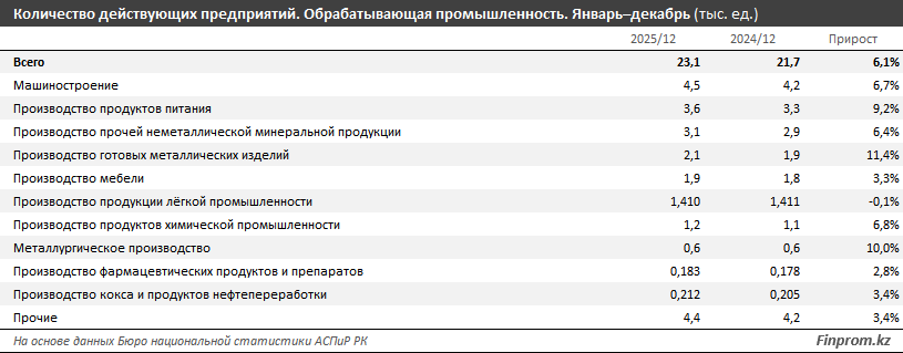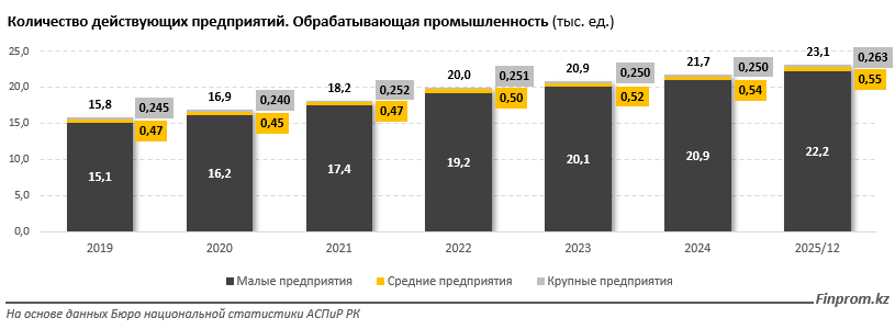 Обрабатывающая промышленность Казахстан демонстрирует устойчивое развитие: количество действующих компаний растёт из года в год, однако структура сектора остаётся почти неизменной - более 95% предприятий по-прежнему приходится на малый бизнес, передает inbusiness.kz со ссылкой на finprom.kz.