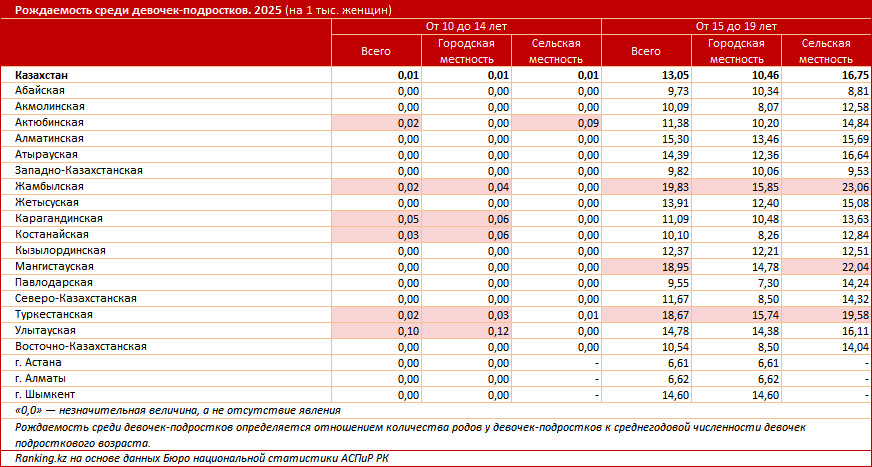 "В 2025 году это были Улытауской области (0,1 на 1 тыс. девочек), Карагандинской области (0,05), Костанайской области (0,03), Жамбылской области, Актюбинской области и Туркестанской области (по 0,02)", - привели данные авторы проведенного исследования.