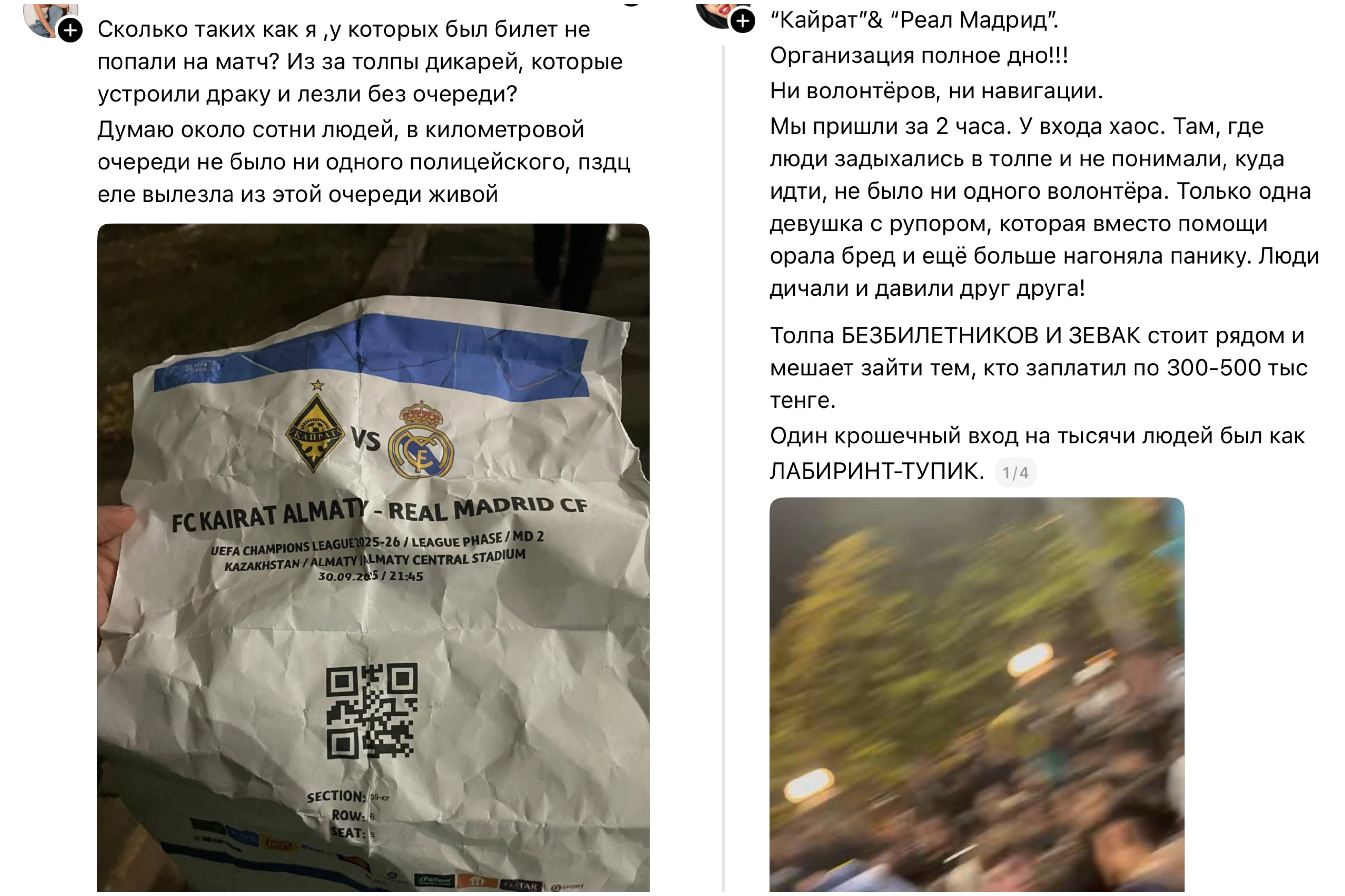 "В сети активно обсуждается ситуация с болельщиками, которые не смогли попасть на матч "Кайрат" - "Реал Мадрид". Вчерашняя игра наглядно показала, что проблема перекупщиков и поддельных билетов остаётся актуальной. Добросовестные зрители не должны становиться жертвами недобросовестных лиц.