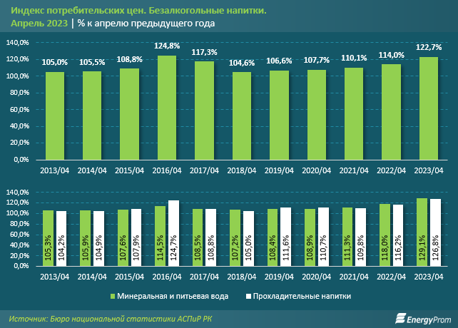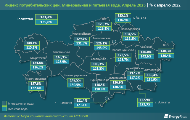 Минеральная вода по итогам апреля 2023 года подорожала на 31,4% за год. Среди регионов РК наибольший годовой рост цен на минеральную воду был отмечен в Жетысуской области (сразу на 66,4%), следом идут Кызылординская (на 49,5%) и Западно-Казахстанская (на 48,1%) области. Наименьший рост цен наблюдался в Улытауской области (на 8,3%), Шымкенте (на 11,4%) и Туркестанской области (на 18,5%).