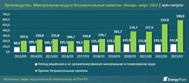 За январь–март текущего года в РК произвели 142,8 млн литров неподслащённой и не ароматизированной минеральной и газированной воды — на 2,6% больше по сравнению с аналогичным периодом 2022-го.
