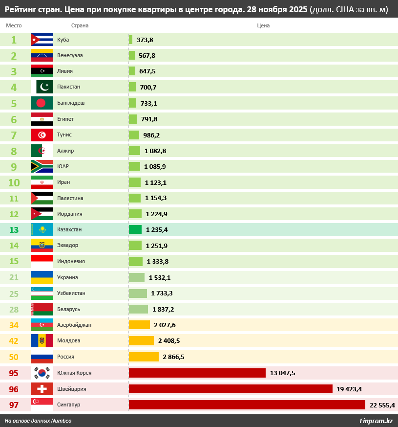 По данным платформы Numbeo, анализирующей цены в 97 странах, Казахстан демонстрирует одну из самых низких средних цен на квадратный метр как в центре крупных городов, так и на окраинах.
