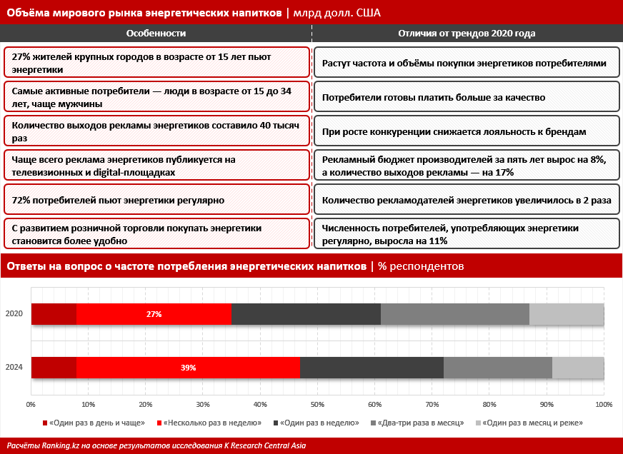 Согласно выводам аналитиков K Research Central Asia, проводившим такие исследования, в 2024 году среди респондентов из крупных городов страны с численностью населения более 100 тыс. человек 27% пили энергетические напитки. Фактически это каждый четвёртый житель мегаполиса или областного центра.