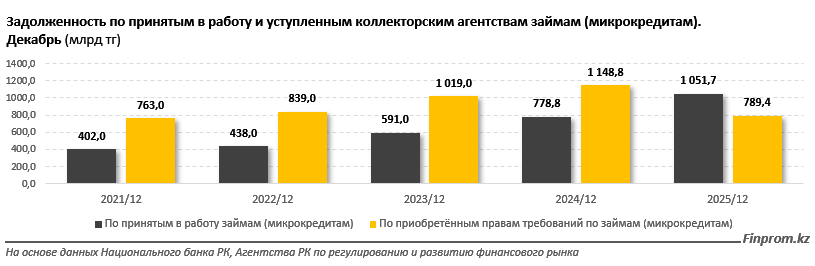 На фоне этих изменений объём задолженности по выкупленным коллекторскими агентствами правам требований сократился за год на 31,3% - с 1,1 трлн до 789,4 млрд тенге. Это первое заметное снижение показателя за весь период наблюдений. Одновременно задолженность, переданная коллекторам без уступки прав требования, наоборот, увеличилась на 35% и достигла 1,1 трлн тенге.