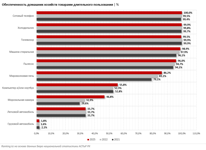 Из товаров длительного пользования в 2025 году домохозяйства РК обеспечены на 100% лишь сотовыми телефонами, сообщает inbusiness.kz со ссылкой на Ranking.kz.