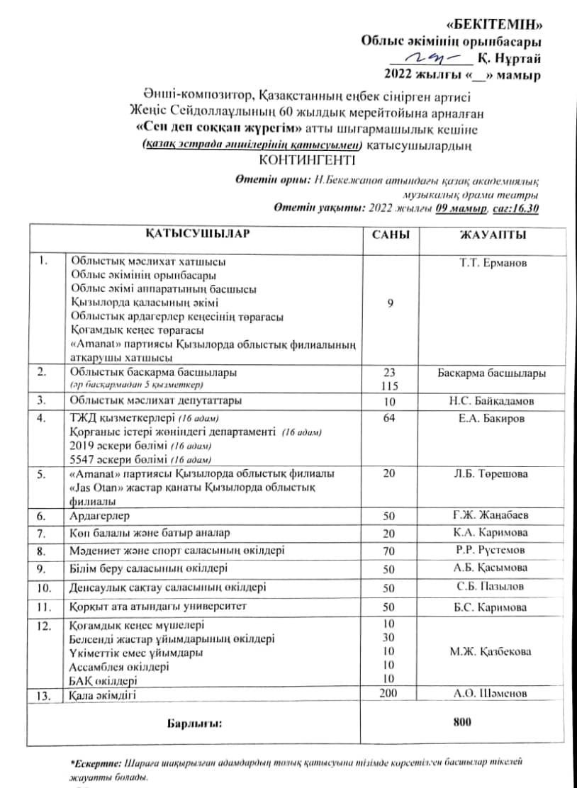 Согласно списку, на концерт должны прийти секретарь областного маслихата, заместитель акима области, руководитель аппарата акима области, аким города Кызылорда, председатель областного совета ветеранов, председатель общественного совета, исполнительный секретарь областного филиала партии Amanat. Всего 9 человек.