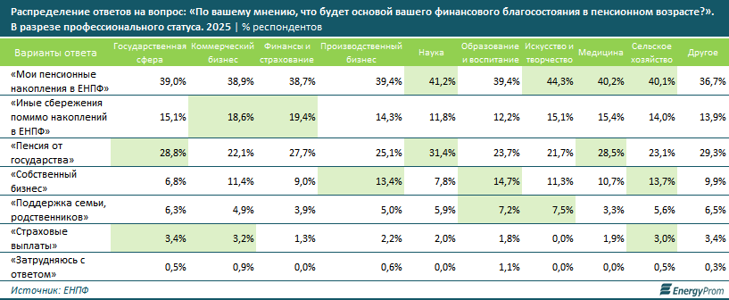 Наибольшая ориентация на свои пенсионные накопления в ЕНПФ в 2025 году наблюдалась среди работников сфер искусства и творчества (44,3% респондентов), науки (41,2%), медицины (40,2%) и АПК (40,1%), передает inbusiness.kz со ссылкой на Еnergyprom.kz.