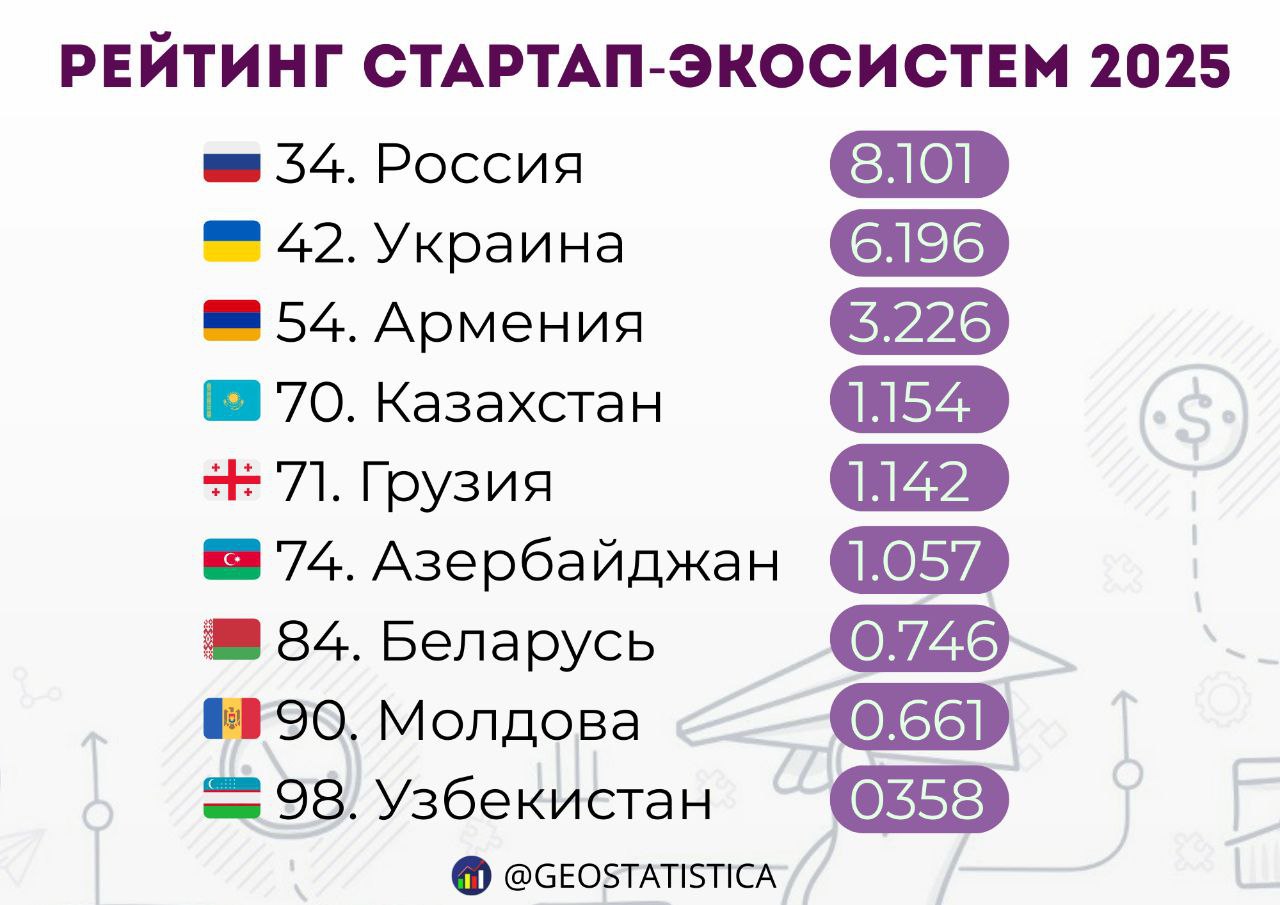 Постсоветские страны в Глобальном рейтинге стартап-экосистем 2025, передает inbusiness.kz со ссылкой на Telegram-канал Геостатистика.