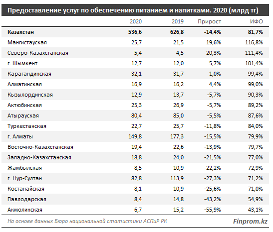 В целом за коронакризисный 2020 год услуги по обеспечению питанием и напитками сократились в реальном выражении сразу на 18,3%, в денежном – на 14,4%, до 536,6 млрд тг.