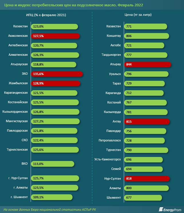 В то же время уже в феврале текущего года цены на подсолнечное масло выросли в среднем по РК сразу на 23% за год, составив 771 тг за литр.