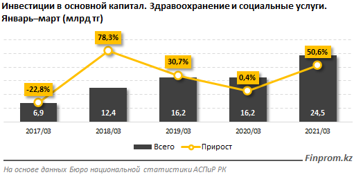 За январь-март 2021 года в здравоохранение и социальные услуги страны вложили 24,5 млрд тг — сразу на 50,6% больше, чем годом ранее. Реальный рост с учетом инфляции составил 50,3%.