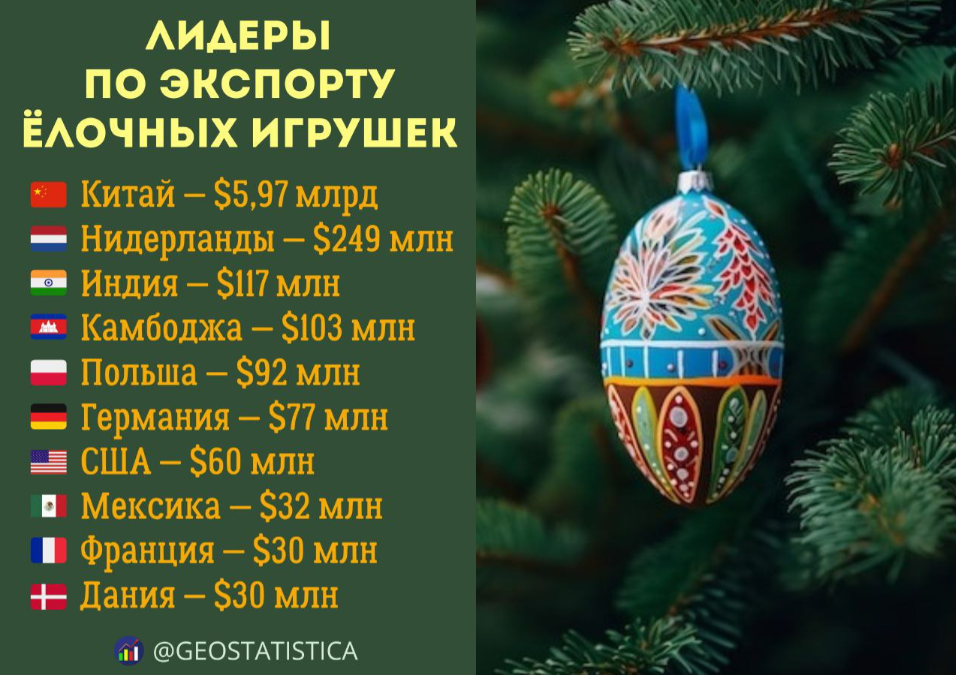 Помимо Нидерландов, в пятёрку крупнейших экспортеров входят Индия, Камбоджа и Польша. Однако их совокупные поставки всё ещё значительно уступают китайским, что подтверждает доминирующую роль Поднебесной в глобальном производстве и сбыте новогодних товаров.