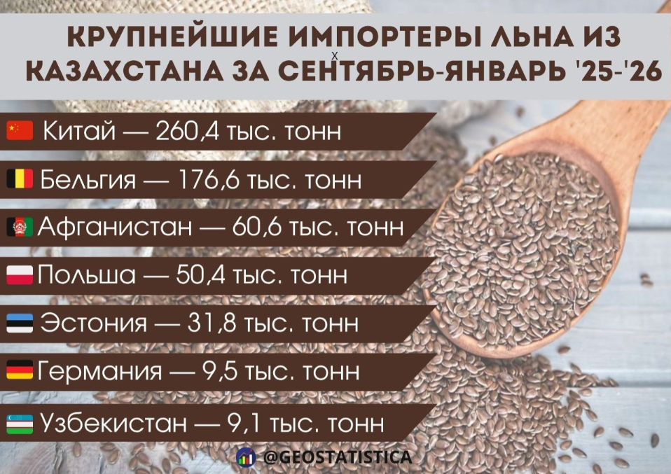 "Экспорт льна из Казахстана за сентябрь–январь 2025/26 маркетингового года в 2,4 раза превысил показатели аналогичного периода прошлого года и уже на 21% обогнал общий объем экспорта за весь предыдущий сезон. Такая динамика говорит не просто о росте, а о качественном скачке спроса на казахстанскую продукцию", - пишет "Геостатистика".