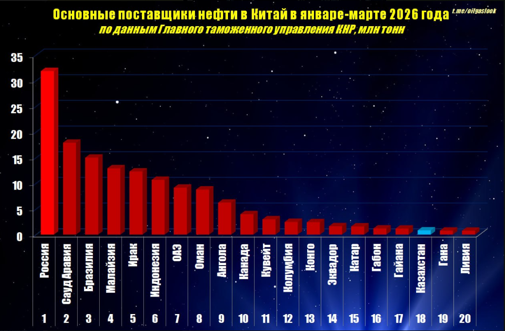 Китай, остающийся крупнейшим импортёром нефти в мире, в первом квартале текущего года закупил за рубежом 146,8 миллиона тонн сырья на сумму 71,6 миллиарда долларов. Новые данные отражают не только масштаб спроса, но и расстановку сил среди ключевых поставщиков на одном из самых важных энергетических рынков, передает inbusiness.kz со ссылкой на телеграм-канал OilGazLook.